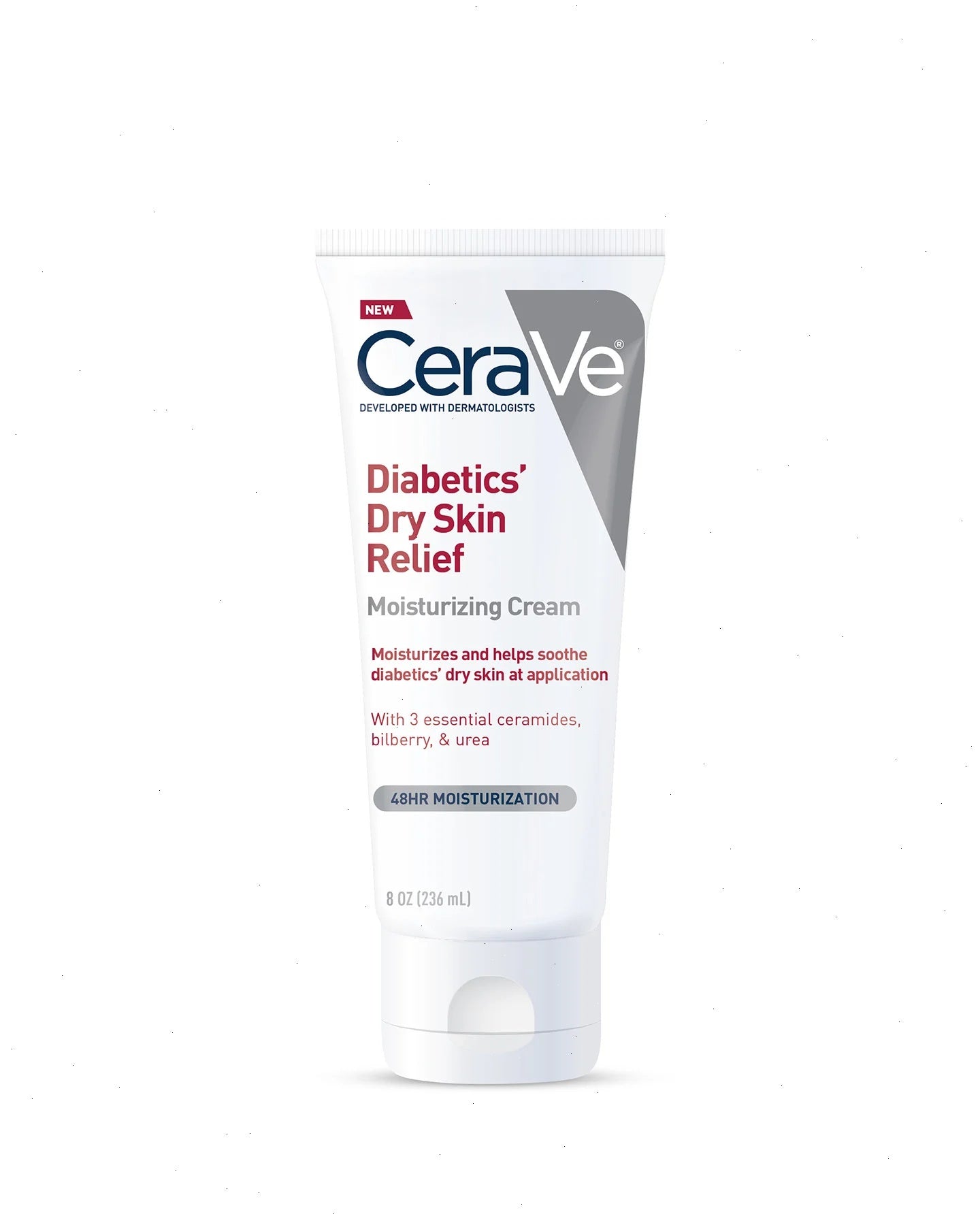 CeraVe Diabetics' Dry Skin Relief Moisturizing Cream was developed with dermatologists to provide soothing 48-hour hydration for dry skin, and has three essential ceramides to help restore the skin's protective barrier, urea to help draw moisture from the environment into your skin and bilberry to help provide antioxidant benefits.