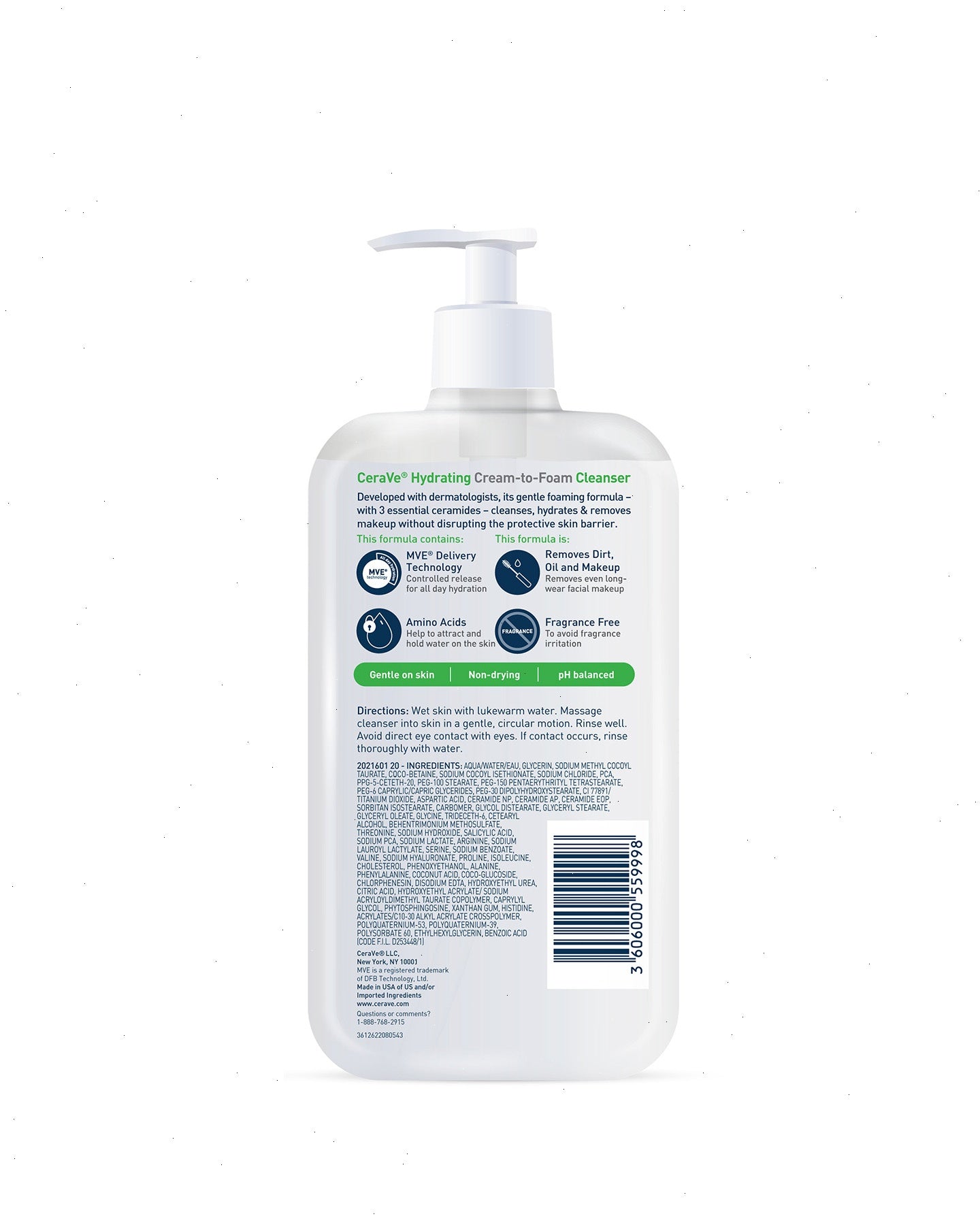 CeraVe Hydrating Cream-to-Foam Cleanser, developed with dermatologists, begins as a cream before transforming to a soft foam when you begin to lather it on the skin with water, and effectively removes dirt and makeup without stripping the skin’s natural moisture or leaving it feeling tight and dry.