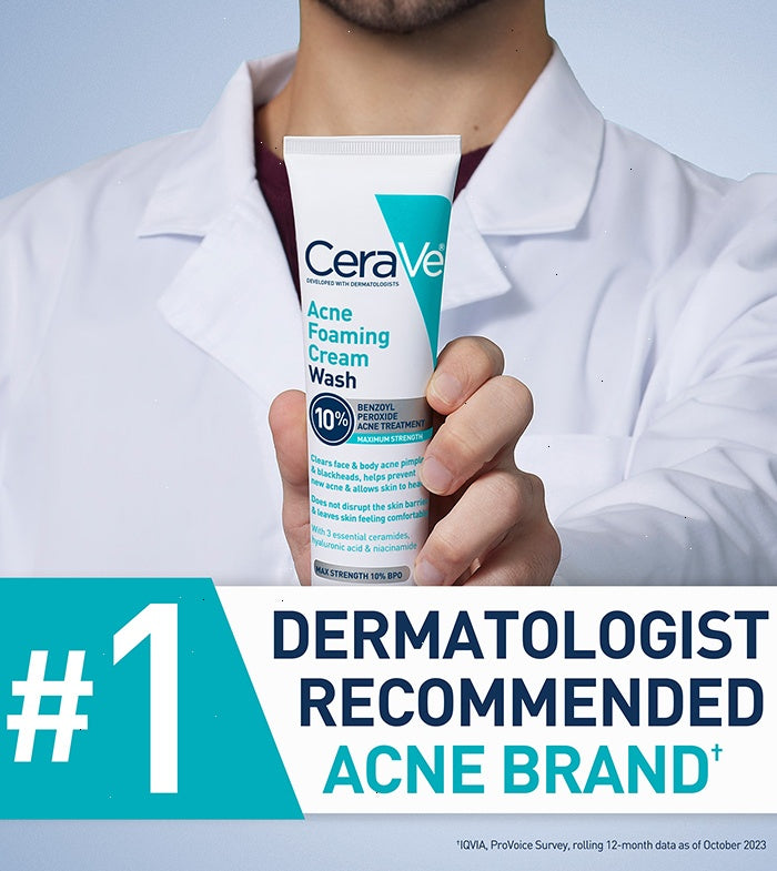 Formulated with dermatologists specifically for acne-prone skin, this benzoyl peroxide wash features the proven, FDA-approved acne-fighting ingredients, yet is both gentle and effective in helping to manage active acne breakouts.1 It helps clear acne pimples, whiteheads, and blackheads from the skin’s surface when used as either a facial cleanser or body cleanser. Bonus: CeraVe Acne Foaming Cream Wash can also help prevent new acne from forming and allow the skin time to heal.
