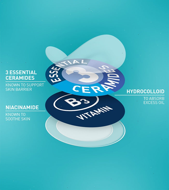 CeraVe Blemish Barrier Patches are the first and only hydrocolloid blemish patches with three essential ceramides plus niacinamide, helping to soothe the skin while immediately reducing the appearance of all types of blemishes upon application. Developed by dermatologists for clinically proven results, this blemish patch formula absorbs oil in as little as 3 hours and helps protect the delicate skin barrier—decreasing the risk of developing post-blemish marks.