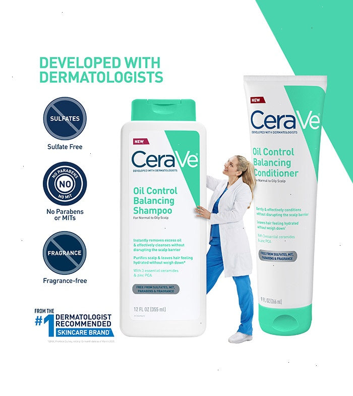 Developed with dermatologists, CeraVe Oil Control Balancing Shampoo removes excess oil from the scalp and leaves hair feeling hydrated without disrupting the scalp barrier.* The allergy-tested formula is free of phtalates, sulfates, dyes, parabens, fragrance, and MIT for both men and women and ages 13+.